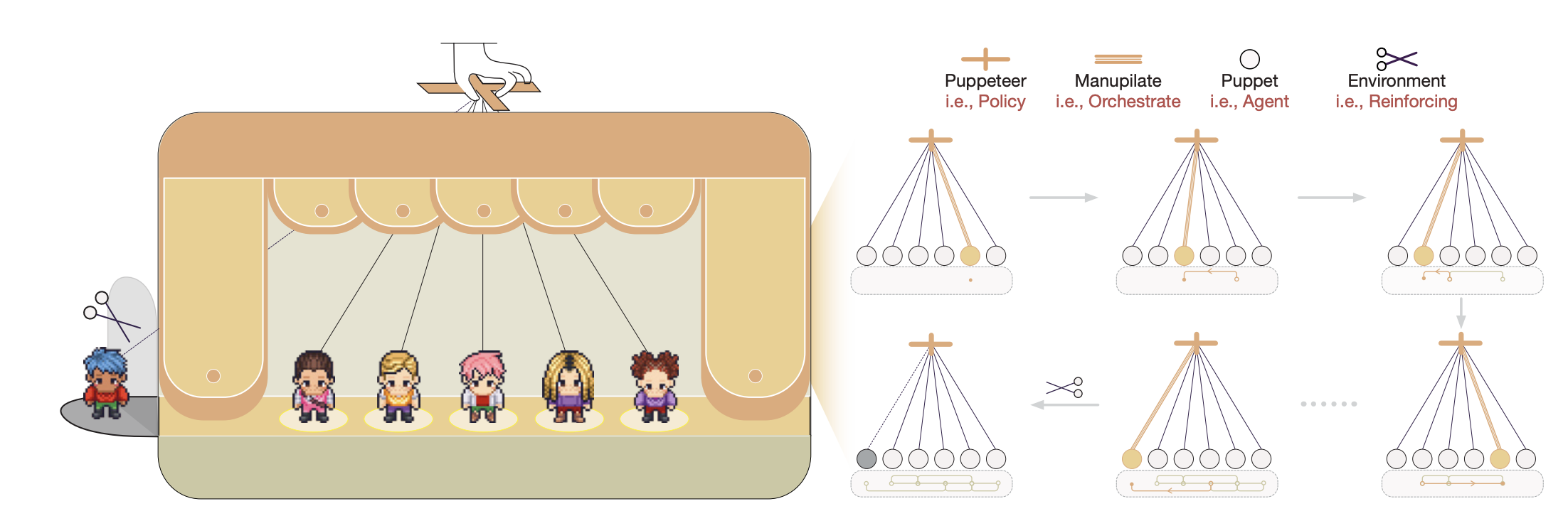 •May 26, 2025: 🎉 We propose a novel puppeteer-style paradigm for multi-agent collaboration among large language model based agents. By leveraging a learnable central orchestrator optimized with reinforcement learning, our method dynamically activates and sequences agents to construct efficient, context-aware reasoning paths. This approach not only improves reasoning quality but also reduces computational costs, enabling scalable and adaptable multi-agent cooperation in complex tasks. See our paper in Multi-Agent Collaboration via Evolving Orchestration.