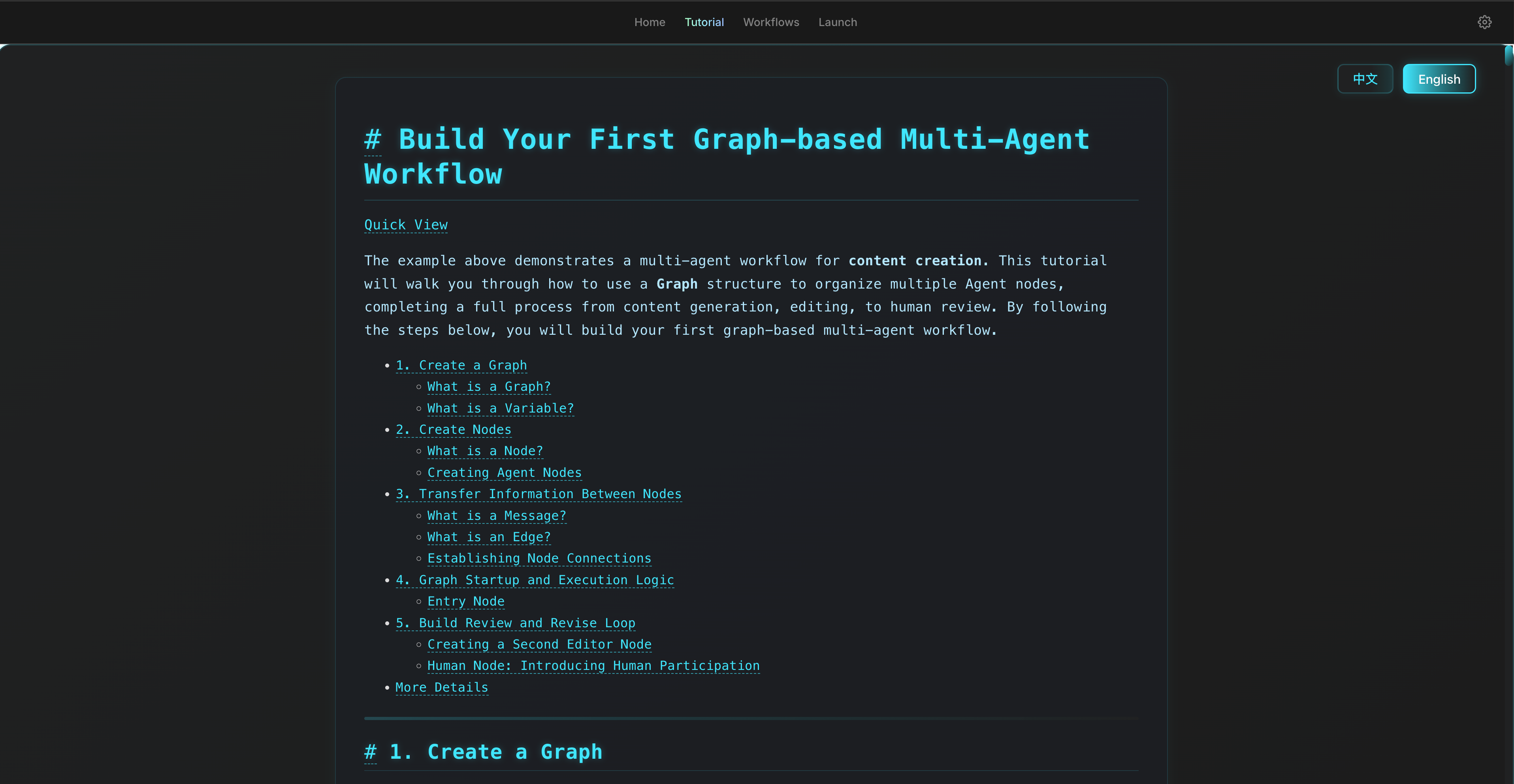 - Workflow: A visual canvas to design your multi-agent systems. Configure node parameters, define context flows, and orchestrate complex agent interactions with drag-and-drop ease.