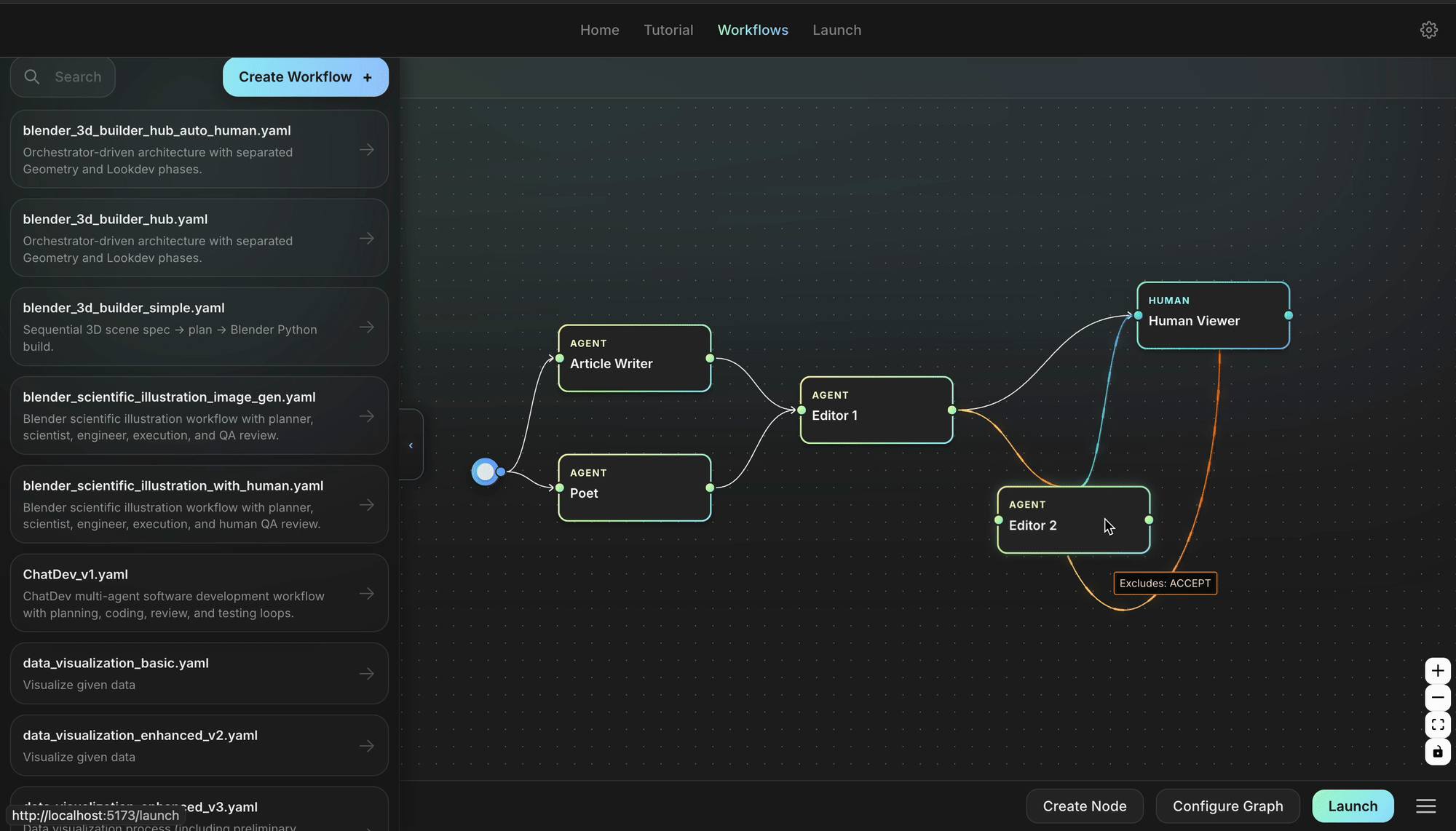 - Launch: Initiate workflows, monitor real-time logs, inspect intermediate artifacts, and provide human-in-the-loop feedback.